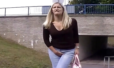 Pale busty blondie pisses and then sucks a shaft on the river bank